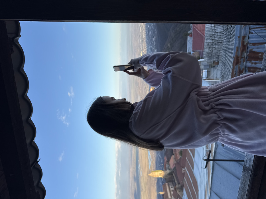 A female individual is observed in profile from the right, standing in what appears to be a balcony or window opening within the city of Sighnaghi, Georgia