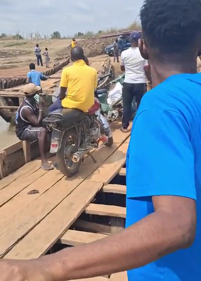 group of people standing on a wooden structure that appears to be a makeshift bridge over a body of water. Some people are sitting or standing on motorcycles. The wooden structure seems to be constructed from planks and beams. A man in a blue shirt is holding the camera and speaking. The camera then pans to show more people on the bridge, and beyond it, a collection of wooden boats docked along the riverbank. The water is murky and brown. The sky is overcast. Several people are visible in the boats or near them on the shore. One man is using his phone. The boats are simple, wooden constructions. The area beyond the riverbank appears sandy.