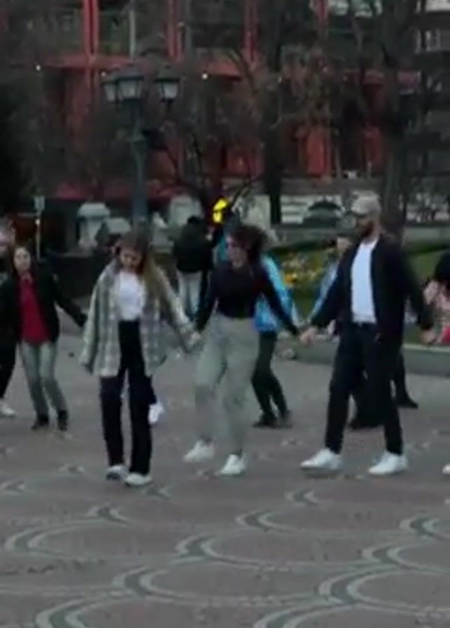 A group of approximately 15 people are dancing in a circle in a public square. They are holding hands and performing a coordinated step. The square is paved with a decorative pattern. Behind the dancers are various buildings, some modern and some older with architectural details. There are also trees without leaves visible in the background. The overall lighting suggests it is daytime, likely during the late fall or early spring due to the bare trees and the clothing worn by the dancers. A lamppost can be seen near the edge of the dance circle.