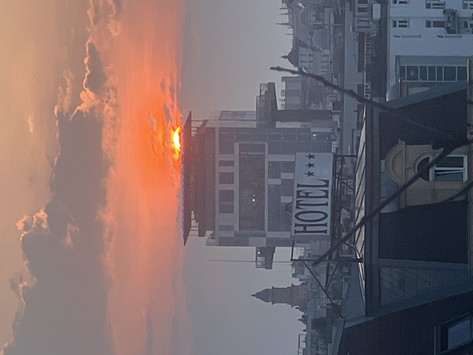 The image depicts an urban landscape at sunset in Vienna, Austria, viewed from an elevated position. The setting sun, a brilliant orange and yellow disc partially obscured by clouds, is centrally positioned atop the flat roof of the **25hours Hotel at MuseumsQuartier** located at Lerchenfelder Str. 1-3, 1070 Vienna. In the mid-ground, a prominent white rectangular sign with red lettering reading "HOTEL ***" is affixed to the side of the **Ruby Marie Hotel Vienna** at Mariahilfer Straße 120, 1070 Vienna. To the left of these hotel structures, in the background, the distinctive domed tower of the **Mariahilfer Kirche** (Mariahilf Church) is visible. The sky is dominated by a gradient of warm sunset hues, ranging from intense orange and red around the sun to softer pinks and grays, with scattered, dark-edged clouds. The lower half of the frame presents the dark, shadowed rooftops of multiple buildings, some featuring traditional dormer windows. Out-of-focus dark branches or wires are visible in the immediate foreground. The scene is characterized by strong backlighting, rendering many elements in silhouette against the bright sky. No individuals, vehicles, or specific actions are discernible.