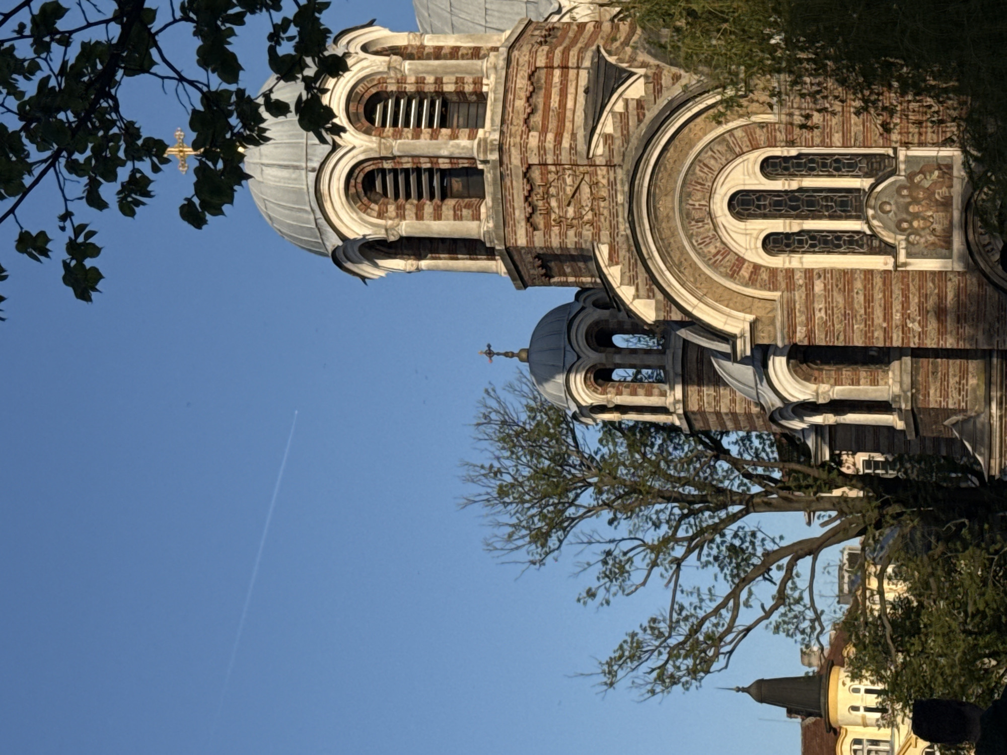The image depicts the exterior of St. Nedelya Church in Sofia, Bulgaria, taken from a low angle. The church's architectural details are visible, including domes, arched windows, brickwork, and decorative elements. A gold cross tops one of the domes. The sky is a clear blue. Parts of trees frame the church on both sides. A contrail is visible in the sky. A building with a spire is partially visible in the bottom right corner.