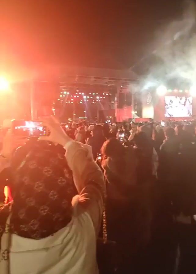 concert at night, likely an outdoor venue. A large crowd is gathered, facing a brightly lit stage. Smoke and red flares are visible above the crowd. Many people are holding up phones, presumably to record the performance. A large screen on stage displays the performers. In the foreground, individuals are taking videos and photos of the concert. The ground appears wet, reflecting the lights. Someone is lifted on another person's shoulders.