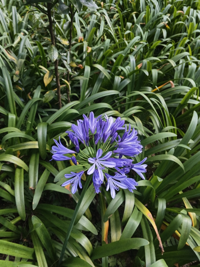 The scene, located in Munyati, Zimbabwe, features a single prominent stalk of bright purple, trumpet-shaped flowers. The spherical flower cluster contains numerous individual florets, some fully open with visible stamens and lighter inner petals, while others remain partially closed. This flowering plant is centrally positioned and sharply focused against a dense background of its own elongated, strap-like green leaves. Some background foliage displays localized yellowing. In the upper left quadrant, a thinner, darker plant stem with smaller, rounder green leaves is partially visible amongst the primary foliage. The environment consists solely of natural vegetation; no individuals or artificial objects are present.
