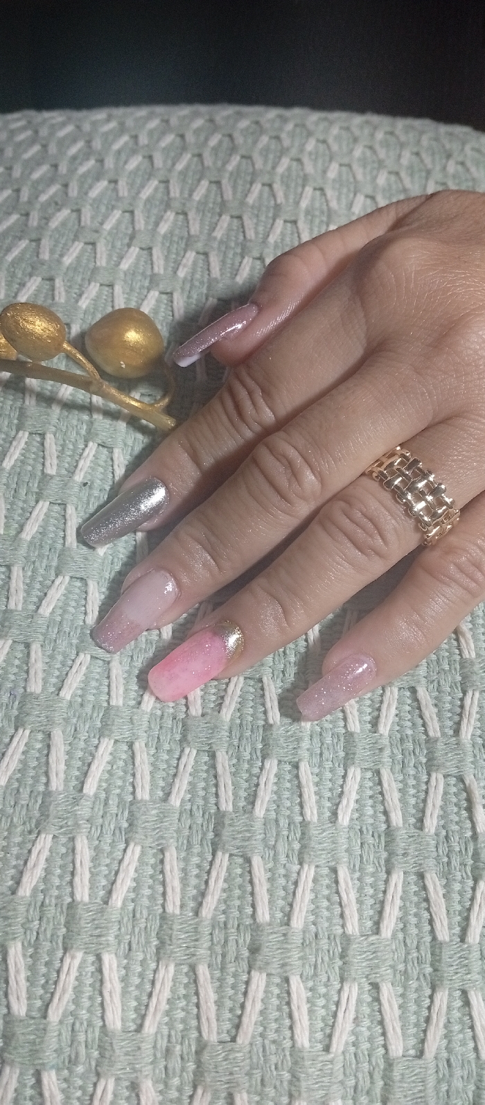- "A woman's hand showcases long, manicured nails in varying designs: light pink ombre, a glittery silver, and a pink shade with a gold tip" by FM-TSYyh2, licensed under CC BY 4.0