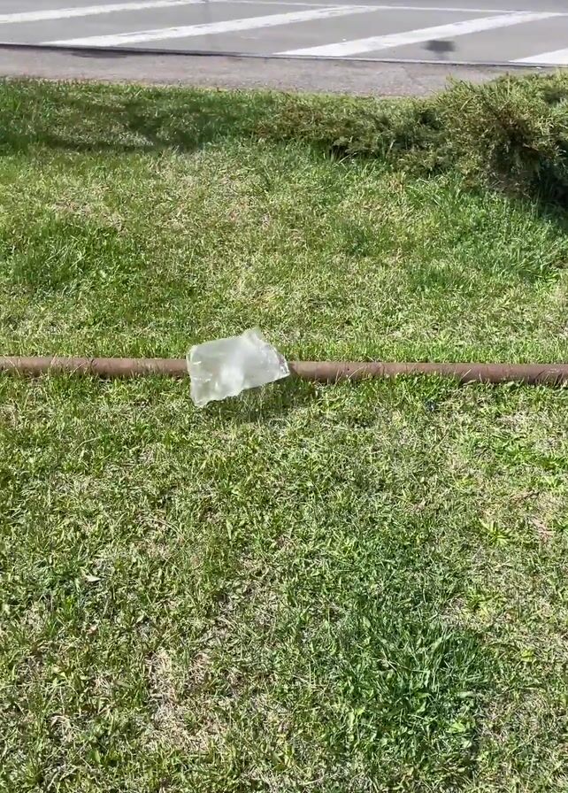 patch of grass next to a city street. A clear plastic bag is lying on the grass, along with a rusty metal pipe, a small green metal post, and a piece of white plastic. Two pedestrians walk past on the sidewalk beside the street. Cars are driving by. The weather appears sunny.