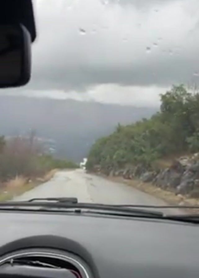 view from inside a car driving down a wet, winding road on a cloudy, rainy day. The road is surrounded by green vegetation and rocky terrain. In the distance, there's a town or settlement visible through the mist or fog. Raindrops are visible on the windshield. The car's dashboard is visible.