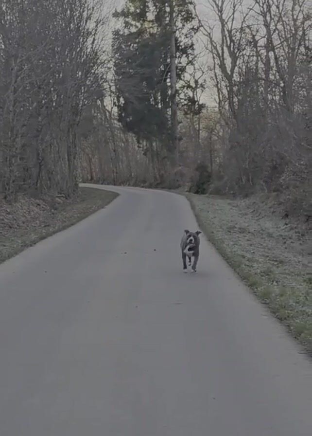 gray and white dog running toward the camera on a gray asphalt road. The road curves gently to the left. On both sides of the road are bare trees. The sky is a muted gray color. The dog is a medium-sized, muscular breed, possibly a pit bull or Staffordshire terrier mix, with a white chest and white paws. The dog appears to be running at a steady pace, with its tail wagging.