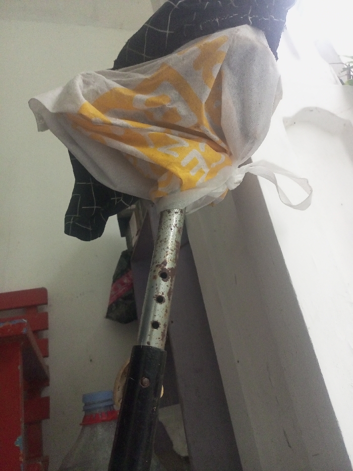 The image depicts an indoor or sheltered scene in the city of Zee Pin Kone, Myanmar. A vertical, weathered metal pole with visible rust and multiple adjustment holes is centrally positioned. Wrapped around the upper section of this pole is a white, translucent fabric tied with a knot, partially covering a yellow fabric item with white lettering, which appears to spell "ZEE" and other partial characters. Behind this, a dark fabric with a white grid pattern is also visible. To the lower left, a portion of a red, slatted object, possibly furniture, is present, alongside the top of a clear plastic bottle with a blue cap. The background consists of a light-colored wall with a prominent corner feature on the right side. No individuals are present, and no actions are discernible.