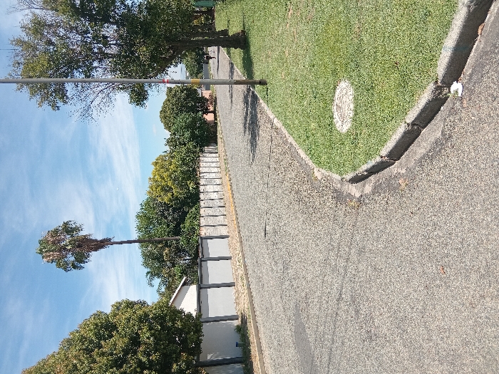 The image displays a daytime street scene in Germiston, South Africa. A paved asphalt road, appearing light grey with a textured surface, occupies the foreground and mid-ground, gently curving to the right. A concrete curb separates the road from a strip of green, manicured grass on the right side. Embedded in this grass is a circular metal manhole cover. A slender, light grey utility pole with a small red and white marking is positioned vertically on the right verge. Several mature trees with green foliage line the right side of the road, casting shadows. On the left, a long, segmented grey concrete boundary wall runs parallel to the road. Behind this wall, a section of a white building with a dark roof is visible, along with dense green tree cover. A very tall palm tree with a slender trunk and brown fronds stands prominently above the other trees on the left side of the frame. In the far distance along the road, two small, indistinct human figures are visible, walking away from the viewer on the right side of the pavement. The sky is blue with scattered white, wispy clouds. Direct sunlight illuminates the scene. A small piece of white debris is present on the curb in the lower right.