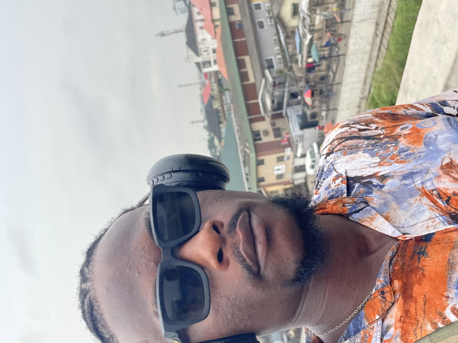 An adult male is prominently featured in the foreground, facing slightly right and looking directly towards the camera. He has dark skin, braided hair, a trimmed mustache, and a goatee. He is wearing black square-framed sunglasses and black over-ear headphones. His attire consists of a short-sleeved, collared shirt patterned with abstract orange, blue, and white tones, and a silver-colored chain is visible around his neck. The background depicts an urban environment in Ikeja, Nigeria, viewed from an elevated position. A grey concrete barrier is visible in the lower right. Below this barrier, a set of parallel railway tracks runs horizontally. Beyond the tracks, a bustling area comprises various single and multi-story buildings with roofs of differing colors (red, green, white). Several market stalls, identifiable by colorful umbrellas (red, blue, green), are scattered throughout this area, alongside indistinct human figures and a white van. The sky above is uniformly overcast and light grey.