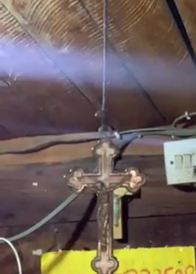 close-up view of a ceiling with wooden planks and a hanging metal cross. Other objects include a smaller wooden cross and a yellow sign with a phone number. There are also visible wires and electrical components attached to the wood. The lighting is dim, with a blue-ish glow. The camera is static.