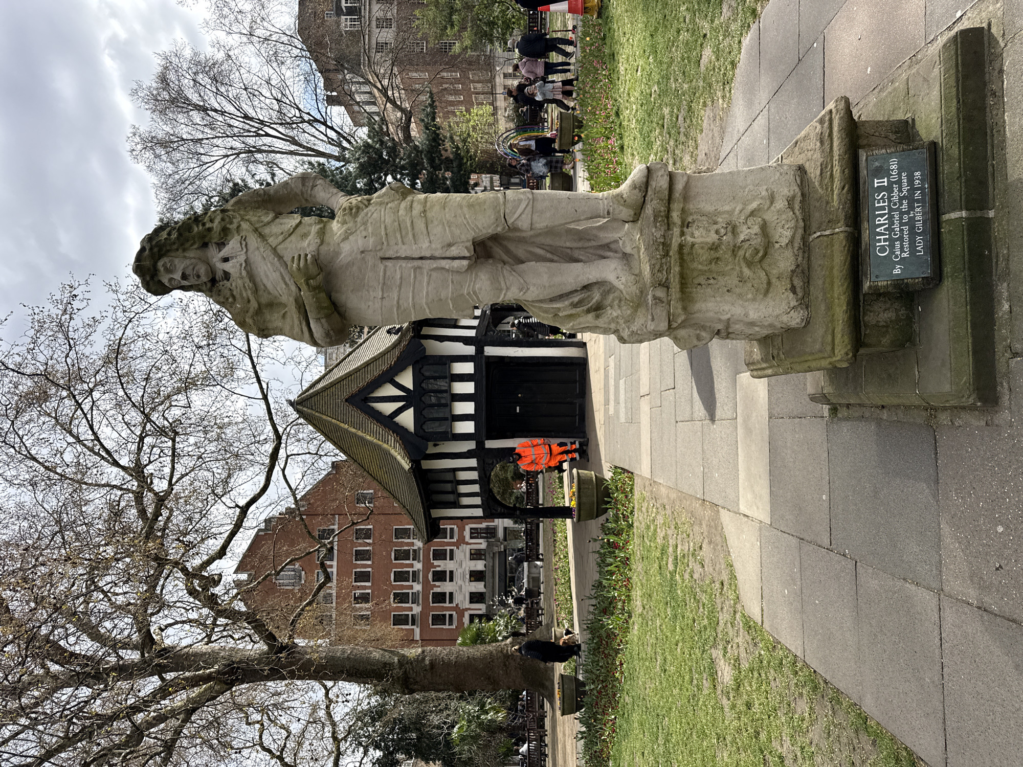 statue of King Charles II, standing on a pedestal, located in Soho Square in the City of Westminster, London. The statue is made of stone and is weathered. A plaque on the base indicates it was sculpted by Caius Gabriel Cibber in 1681 and restored by Lady Gilbert in 1938. Behind the statue is a Tudor-style building with black and white timber framing. An individual in an orange hi-vis jacket is visible near the building. In the background, there are more buildings and people. A bare tree is also visible on the left side of the image. The ground is paved with stone slabs and there are patches of grass. The sky is overcast.