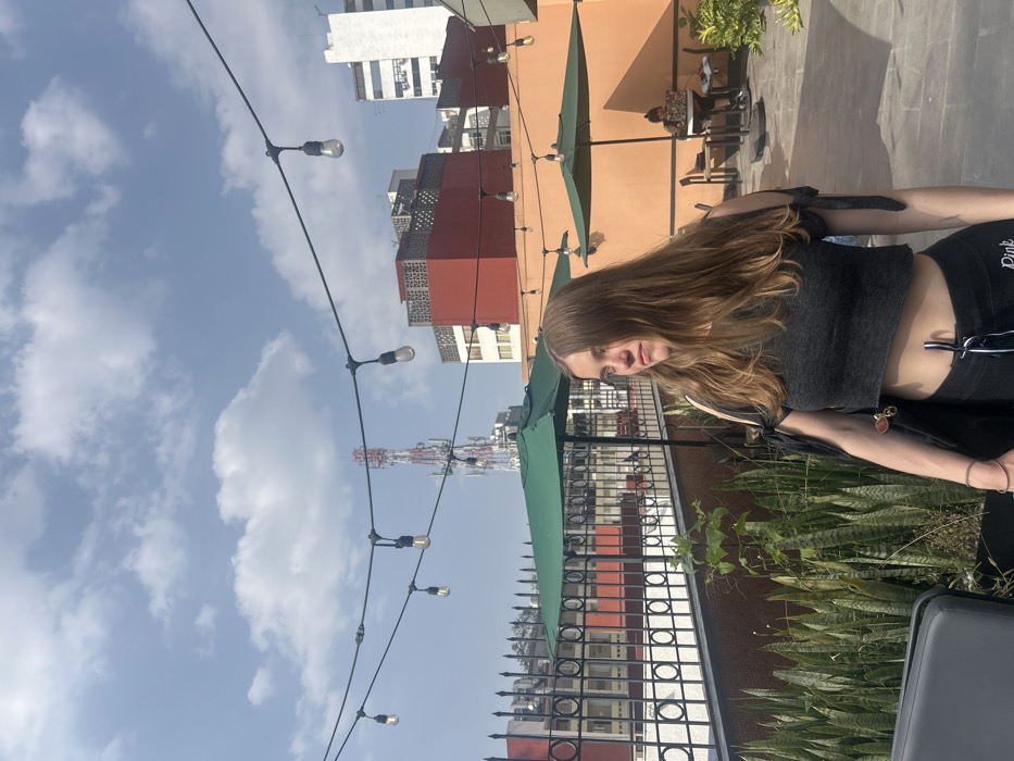 This image captures an outdoor rooftop scene in Mexico City, Mexico, under a clear blue sky with scattered white clouds