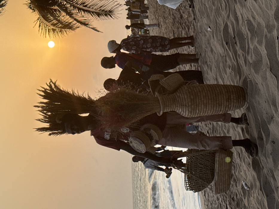 On a sandy beach at sunset, a man is selling woven baskets and decorations