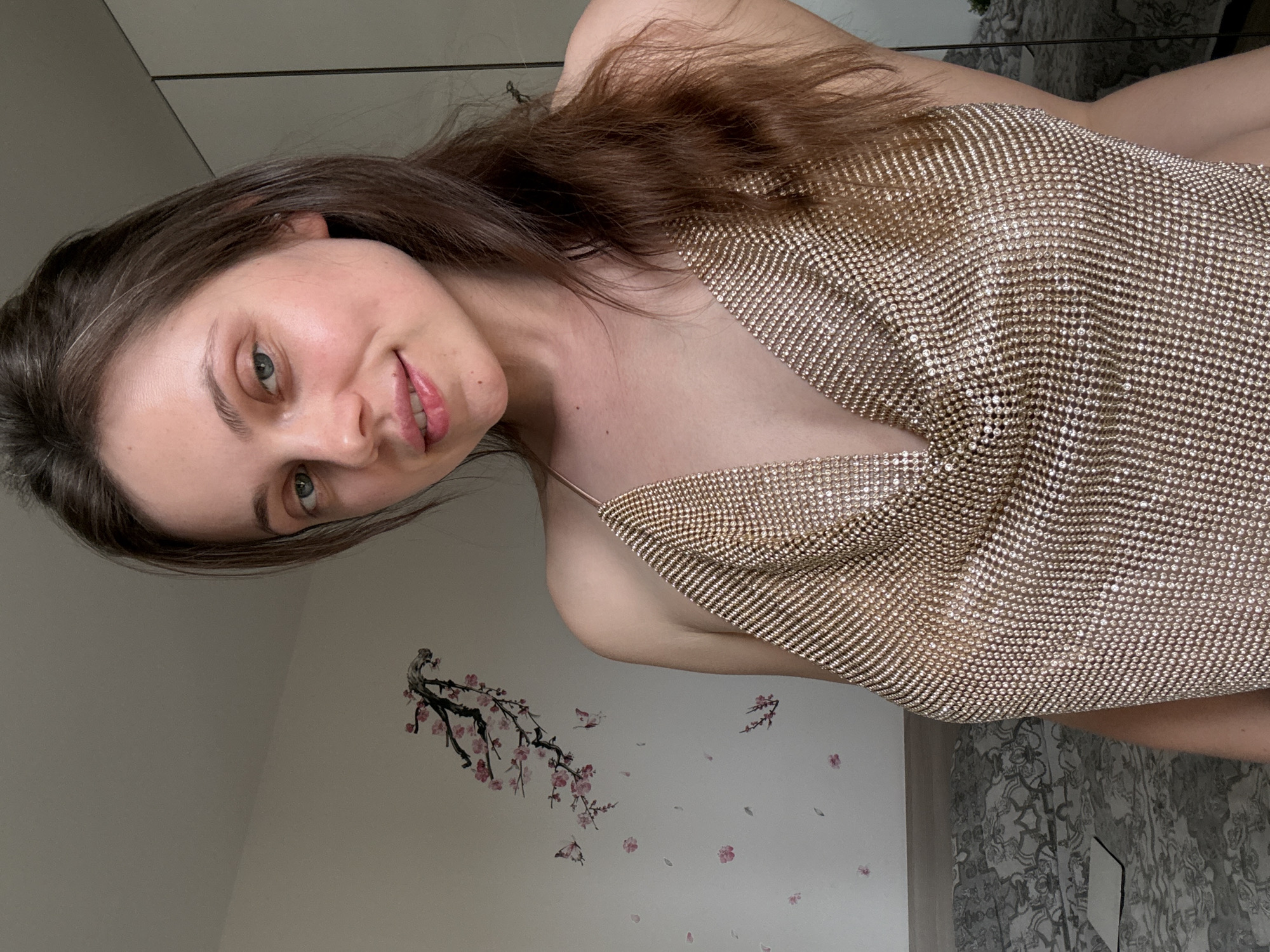 A female subject, identified as a young adult, is depicted in a self-portrait within an indoor setting, specified to be located in the city of Ercolano, Italy. She has long, dark brown hair, light-colored eyes, and minimal facial makeup, presenting with a slight smile and her lips slightly parted. The subject is wearing a gold-colored, sleeveless, halter-neck top composed of a dense mesh embedded with numerous small, reflective elements, featuring a deep V-neckline and a draped cowl collar. The background features a light-colored wall adorned with pink cherry blossom branch decals and scattered butterfly/petal motifs. To the subject's right, a reflective wardrobe or closet is visible, showing a distorted reflection of a bed with a grey patterned duvet. The lower portion of the image shows a grey-patterned rug or carpet on the floor, on which a flat, light-colored, square object rests.
