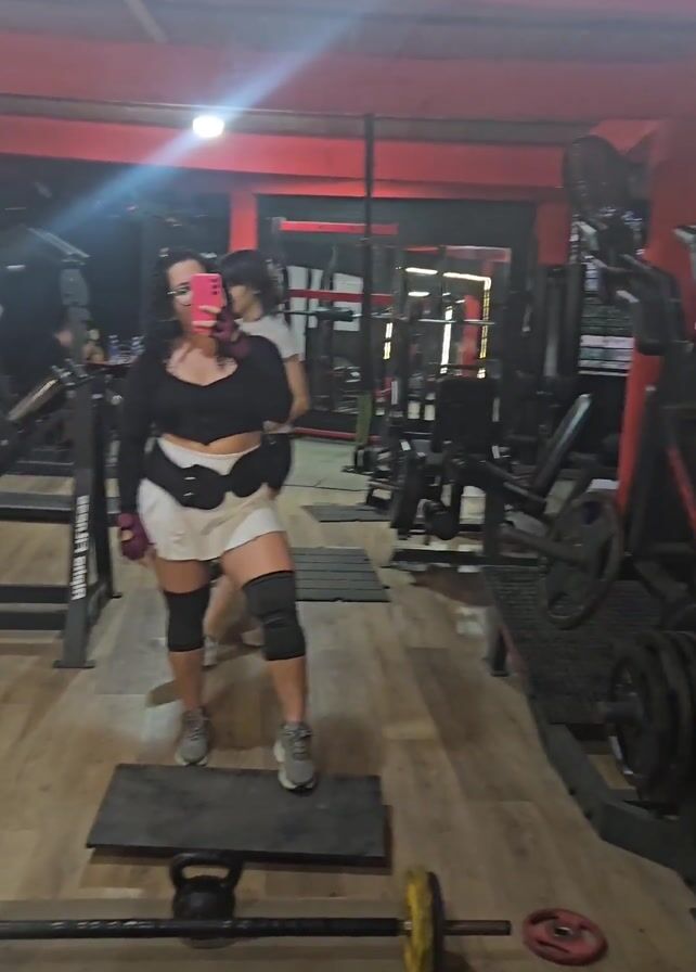 woman in a gym taking a selfie. She is standing on a black mat, wearing a black top, a light-colored skirt, knee pads, and gray sneakers. She has curly hair and is holding a pink phone in her left hand. In front of her is a barbell with yellow weights on each side. In the background, there is gym equipment, including weight machines and racks. Other people are present in the gym, including another woman walking behind the main subject. The gym has a red ceiling and wooden floors.