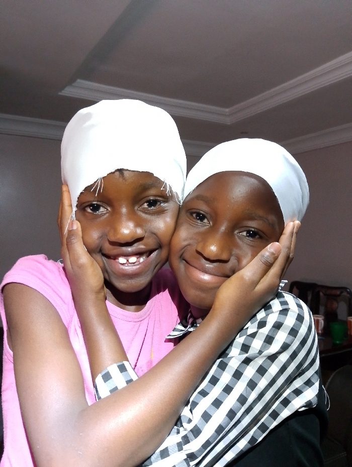 Two young individuals with dark complexions are depicted in a close-up, frontal portrait. Both subjects wear white head coverings. The individual on the left wears a pink t-shirt and exhibits a missing upper front tooth. The individual on the right wears a black and white checkered collared shirt over a dark undershirt. Their inner arms are crossed, with each person's hand cupping the side of the other's face. Both subjects are smiling. The background is an indoor setting with a light-colored wall and decorative ceiling molding visible above. Blurred dark furniture and small containers are partially visible on the right side of the background. The location is in the city of Unknown, Unknown.