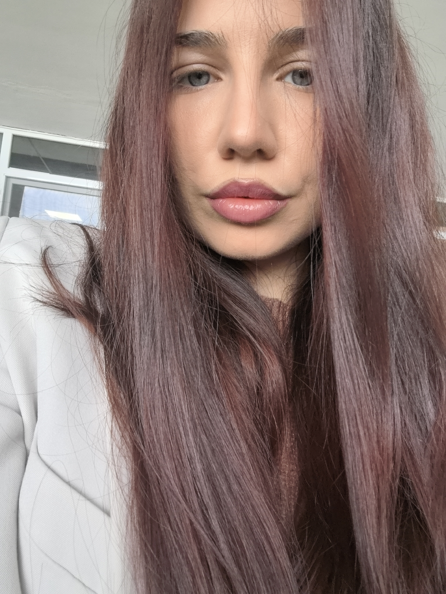 A close-up shot of a woman with long, reddish-brown hair that frames her face. She has fair skin, grey eyes, and full lips with a glossy pink color. She is wearing a light grey blazer with subtle pinstripes. The background appears to be an interior space with a window visible at the top. There is no information about the location being in the city of Bogomilovo, Bulgaria.