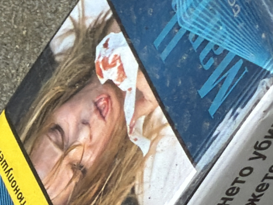 A Marlboro cigarette pack, specifically appearing to be "Marlboro Blue" based on its dark blue and light blue color scheme, is observed on an unidentifiable textured surface, possibly outdoors, under daylight conditions in Stara Zagora, Bulgaria. The upper portion of the pack features a graphic health warning image. This image depicts a light-skinned individual, likely female, with blonde hair, shown from the chest up. Her eyes are closed or partially closed. Her mouth is open, revealing a tongue stained with blood. A crumpled white tissue or cloth, heavily saturated with red blood, is held in her hand near her mouth/chin. Above this image, a yellow band contains partial Cyrillic text, "ТЮНОПУШЕН", which translates to "SMOKING" or "TOBACCO SMOKE". At the bottom left of the pack, partially visible white Cyrillic text on a light background reads "нето уби", likely part of a larger health warning such as "Smoking kills."