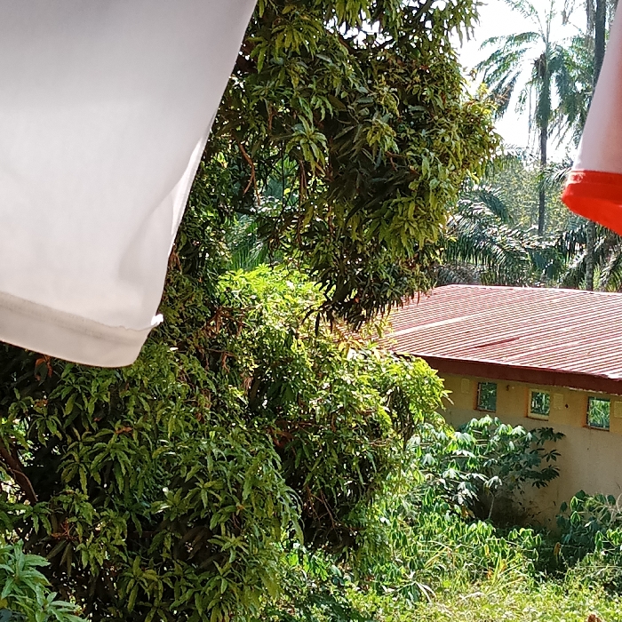 The image depicts an outdoor environment in the city of Tuaniako, Nigeria, primarily composed of dense tropical vegetation and a partial view of a building. In the immediate foreground, the upper-left section is occupied by a large, white, draped fabric object, possibly an item of clothing or linen, showing soft folds. A smaller, orange or reddish fabric object is visible in the upper-right corner. The central and midground are dominated by lush green foliage, including a prominent tree with numerous bright green leaves, likely a mango tree, and various other smaller green plants and bushes below. In the background, several tall palm trees are discernible against a bright, sunlit sky. To the right, partially obscured by the vegetation, is a building with a reddish-brown corrugated metal roof. The light-colored, possibly beige or light yellow, wall of the building is visible below the roofline, featuring at least four small, rectangular openings or windows. The scene is brightly illuminated by daylight. No individuals, animals, or discernible actions are present.