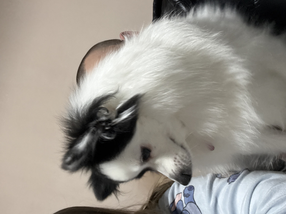 The image captures an indoor domestic scene in Stara Zagora, Bulgaria. A small dog, primarily white with black markings on its head and ears, occupies the central foreground, with its head lowered and turned slightly left. The animal exhibits long, dense fur. A small pink object is visible on its chest. To the left, a human subject, identifiable by long, light-colored hair and a light blue long-sleeved garment featuring a patterned design, has their left arm visible, appearing to hold or cradle the dog. To the right and behind the dog, a second human subject is partially visible, distinguished by a closely shaved head and a portion of a dark, possibly synthetic, garment. The background consists of a uniformly light-colored wall.