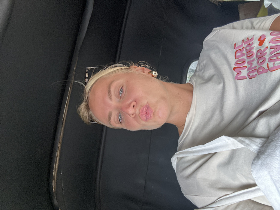 A blonde-haired adult female is depicted in a close-up, selfie-style photograph taken inside a vehicle, identified as being in Ahangama, Sri Lanka. The subject has light blue eyes and is pouting her lips towards the camera. She wears a light-colored long-sleeved shirt featuring the text "MORE AMORE POR FAVOR" in pink and red lettering, accompanied by a small red heart. Gold-colored hoop earrings are visible on both ears, and sunglasses are pushed up onto her head, partially obscured by her hair. A light-colored strap, possibly from a bag, is visible over her left shoulder. The vehicle's interior features a dark, fabric-covered ceiling, showing minor wear along the edges, consistent with a tuk-tuk canopy. The background outside the vehicle is indistinct and blurred.