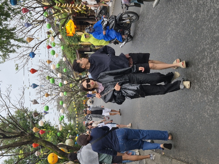 A bustling outdoor scene shows a street decorated with colorful lanterns strung between trees. A group of people walks along the street, including a couple posing for a photo. The woman wears a black jacket and sunglasses, while the man wears a dark shirt and shorts. Several parked scooters are visible. Other pedestrians stroll by, creating a lively atmosphere.