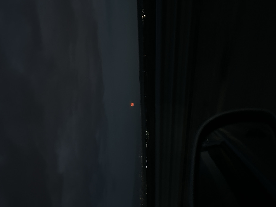 The image depicts a nighttime or deep twilight scene situated in Sofia, Bulgaria. The sky, occupying the upper two-thirds of the frame, is overcast with dark grey clouds. A prominent, reddish-orange celestial body, consistent with a full or near-full moon, is centered horizontally within the lower third of the sky. Below the moon, along the distant horizon, a faint scattering of artificial lights indicates a sprawling urban area, identified as Sofia. The lower third of the image is occupied by a dark, horizontal expanse, likely a road surface or a barrier, extending across the width of the frame. In the bottom-left quadrant, the upper portion of a vehicle's side mirror is visible, reflecting indistinct dark shapes. No individuals are present. The perspective suggests the photograph was taken from inside a vehicle.