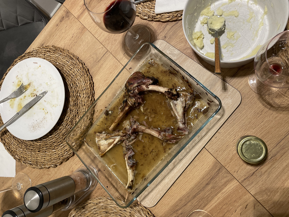 A table displays remnants of a meal. Bare lamb bones rest in a glass baking dish with pan juices, centered on a wooden board. Nearby is a half-empty bowl of mashed potatoes with a spoon. An empty plate with used silverware sits on a woven placemat, along with a pepper grinder. Two glasses, one containing red wine, and a small jar lid are scattered around the scene.