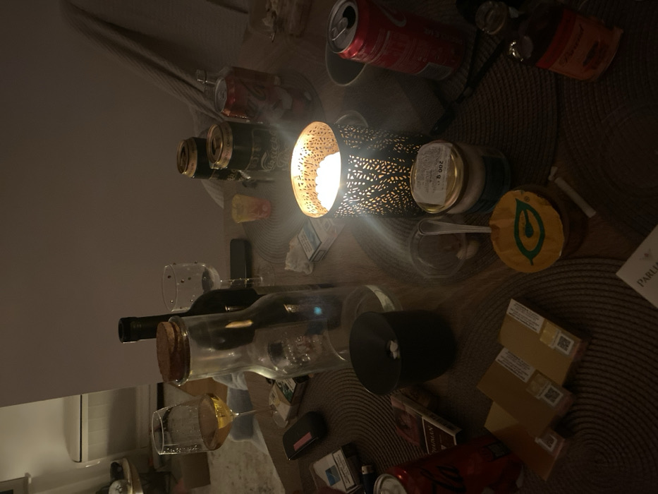 A cluttered table displays an array of items. Two soda cans, liquor bottles, and wine glasses are scattered among various objects. A decorative candle holder casts a warm glow. A jar, a circular container with a leaf logo, and several cigarette packs also occupy the surface. The table is covered with a woven placemat.