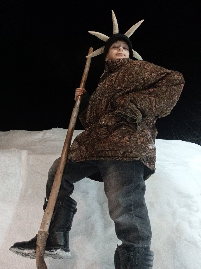 A boy stands on a snowdrift at night, wearing a camouflage jacket, jeans, and black boots. He has a black beanie on his head adorned with horn-like protrusions. He holds a tall, wooden staff, resting one foot forward. The background is dark, contrasting with the white snow. The photo is taken from a low angle, making the subject appear larger.