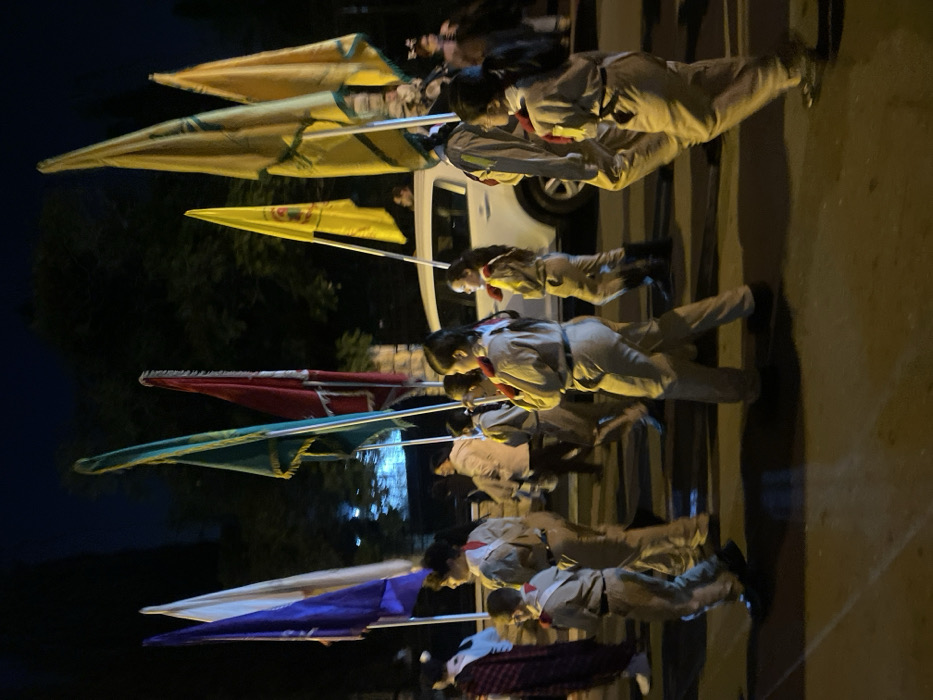 A nighttime scene depicts a procession of approximately fifteen individuals, primarily children and young adults, walking on a paved street in Haifa, Israel. Most participants are dressed in tan/khaki uniforms, complete with long pants, shirts, and red or white neckerchiefs/collars. Many individuals are carrying flags aloft on poles. The flags vary in color, including blue, white, teal-green with gold trim, maroon, and multiple yellow/gold flags, some of which feature discernable emblems or symbols. The procession moves from left to right across the frame, with individuals casting elongated shadows on the dark ground due to artificial lighting from an unseen source. In the mid-ground, a white SUV is visible, either parked or moving slowly alongside the procession. The background is dark, revealing outlines of trees and distant urban structures, with a faintly illuminated light-colored wall visible further back.