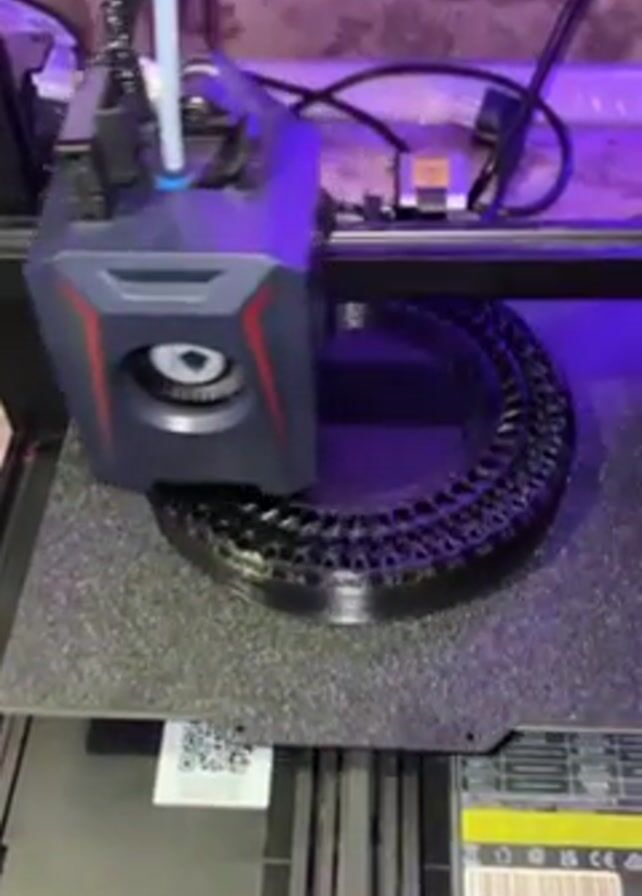 A 3D printer is actively creating a black, circular object with a complex, patterned design