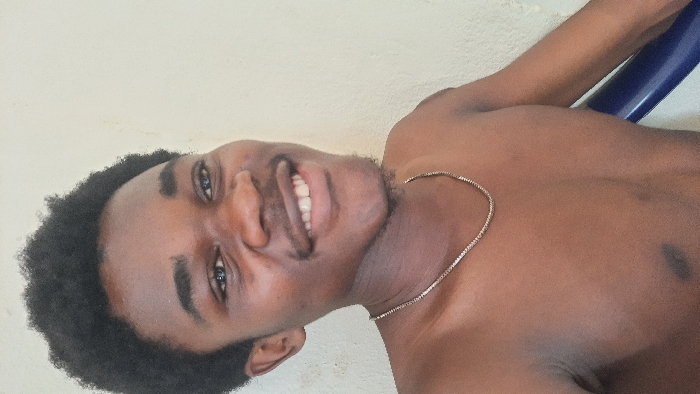 A frontal, waist-up portrait depicts a young male of African descent, estimated to be in his late teens or early twenties, with short, dark, curly hair, a light mustache, and a goatee