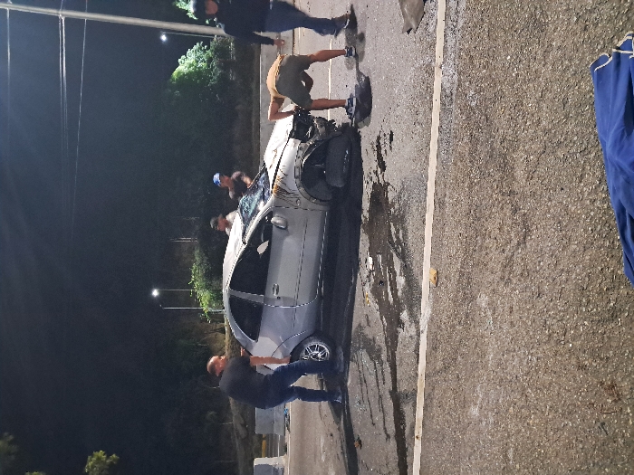 A silver car is heavily damaged on the driver's side with multiple individuals surrounding it. The car is positioned on the shoulder of a road at night, illuminated by streetlights. Debris is scattered around the vehicle, and oil or fluid is visible on the pavement. People are inspecting or assisting with the damaged car, with one appearing to push or steady it. A blue cloth is seen in the periphery.