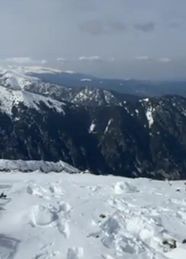 panoramic view of a mountainous landscape covered in snow. The foreground is a field of snow with numerous footprints. In the distance, a series of mountain ranges can be seen, some heavily forested and others covered in snow. The sky is overcast with some patches of lighter clouds and glimpses of sunlight. The camera pans across the scene, showcasing the vastness of the snow-covered terrain.