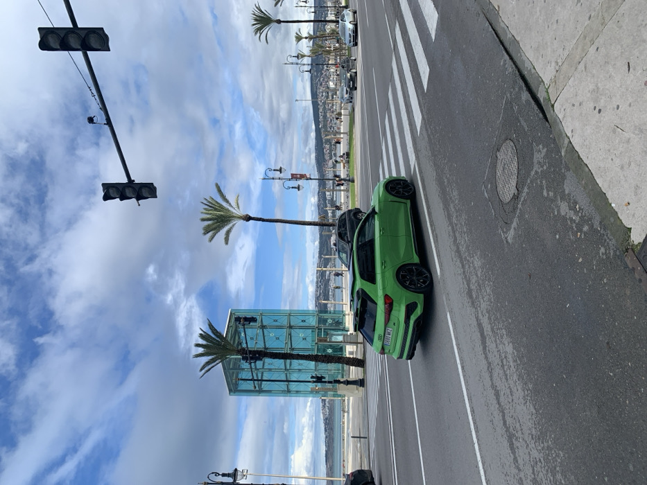 The image depicts an urban coastal scene on Boulevard Mohammed VI, Tangier, Morocco. In the foreground, a bright green Audi RS3 Sportback with Moroccan license plate 2680 MW2 is positioned on a paved asphalt road, oriented towards the right. The road features white lane markings and a white pedestrian crosswalk partially visible beneath the vehicle. A circular metal manhole cover is present on the road surface in the lower right. In the midground, a prominent, multi-story glass elevator structure, appearing light blue-green, stands between two tall palm trees. Beyond this, a wide promenade stretches along the coast, populated by several indistinct individuals walking. Additional palm trees and ornate street light poles are spaced along the promenade. Overhead, two black traffic light fixtures are suspended by a horizontal bar across the roadway. Further down the road, a dark-colored SUV and two lighter-colored sedans are visible. The background reveals a body of water, identified as the Tangier Bay, extending to a distant horizon. Hills covered with scattered white buildings line the far side of the bay. The sky above is partly cloudy, displaying patches of blue interspersed with white and gray stratocumulus clouds. The overall environment suggests a well-maintained urban area with both modern architectural elements and natural coastal features under fair weather conditions.