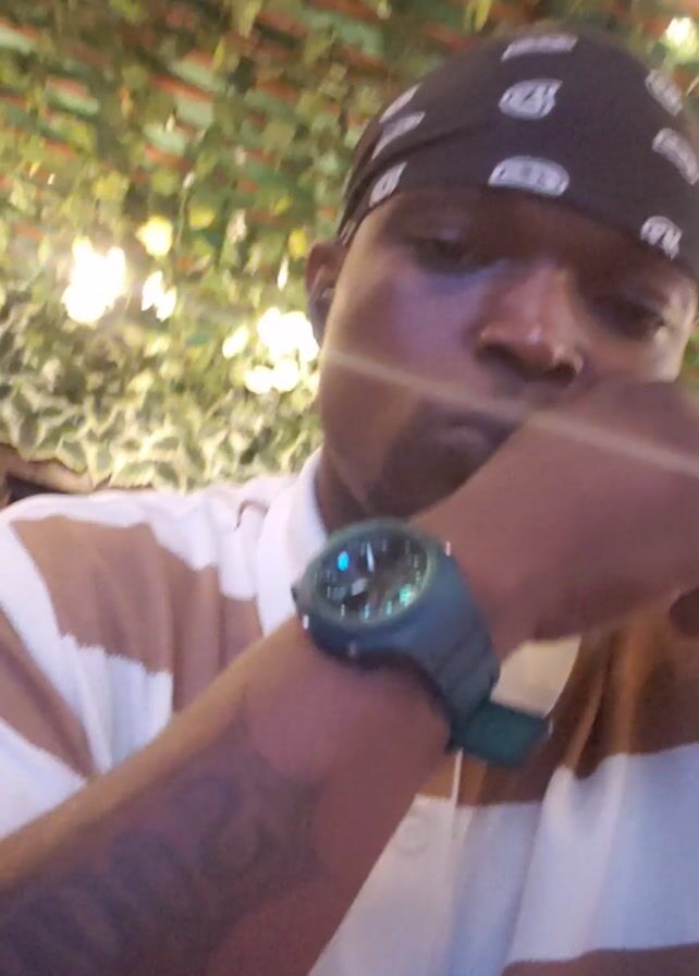 person with dark skin wearing a black bandana with white paisley patterns. They are wearing a white and brown striped shirt and a green wristwatch. The person looks into the camera and raises their wrist to show the wristwatch. The background includes green foliage and string lights. The video is filmed from a low angle.