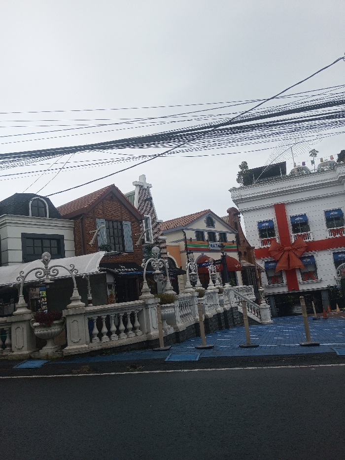 The image depicts a street scene in Babaliya Mal., India, on an overcast day. A dark asphalt road occupies the foreground. To the right, a pedestrian area features blue interlocking paver bricks, from which several light-colored bollards with dark bases protrude. This area is bordered by an ornate white balustrade with classical-style posts, balusters, and decorative elements including planters containing foliage and ornate lamp fixtures. Beyond the balustrade, a row of buildings with European architectural influences is visible. From left to right: 1. A white-facade building with a dark-framed window on the lower visible level and an arched dormer window set into a dark sloping roof. A white awning extends over its ground floor. 2. Adjacent to it, a building with a red brick-patterned facade, a brown tiled roof, and two visible windows featuring light blue shutters. A white, cross-shaped architectural detail tops its roofline. 3. Further right, a cluster of buildings with varying facades, including one with a light-colored facade and a red-tiled roof, featuring signage that partially reads "RATNA" and "PALACE" above and below a red awning, respectively. 4. The prominent building on the far right is a large white structure designed to resemble a wrapped gift box, featuring a large red ribbon and bow prominently displayed on its facade. This building has multiple windows with blue awnings, and its roofline is adorned with decorative elements and small plants. Numerous dark utility wires crisscross the gray sky above the buildings. No individuals are visible in the scene.