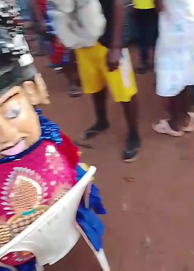 A bizarre, handmade costume appears to be resting on a white plastic chair, surrounded by several people, their legs and feet visible. The costume's centerpiece is a large, painted face with bulging eyes and a protruding tongue, adorned with a red and blue sequined collar and an embroidered bodice-like element. The top of the costume features other smaller figurines, including one in white with hands clasped in prayer. The ground is dirt, and the surrounding people seem to be casually dressed, suggesting an outdoor or semi-outdoor event.