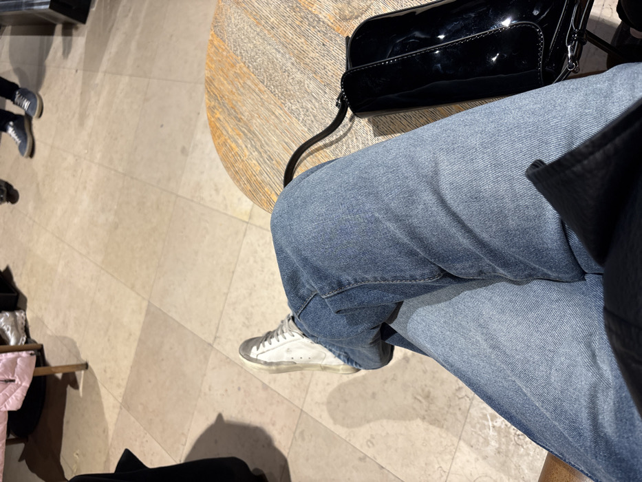 The image captures a first-person, downward-angled view from a seated position within an indoor public space in Paris, France. In the immediate foreground, a person's legs are visible, dressed in light blue denim jeans, crossed at the knees. The visible left foot wears a white and grey distressed sneaker. A dark-colored garment is partially visible on the person's lap. To the right, a black patent leather handbag with a slender strap rests on a round, light-toned wooden table featuring a prominent grain. The floor throughout the scene is covered in large, square, light beige or off-white tiles. In the background, out of focus, multiple individuals are partially discernible, primarily their lower legs and feet, indicating movement or standing. One individual in the background wears blue sneakers. Further background elements include a wooden furniture leg and a partially visible light pink garment. The scene is evenly lit by ambient indoor lighting, casting soft shadows.