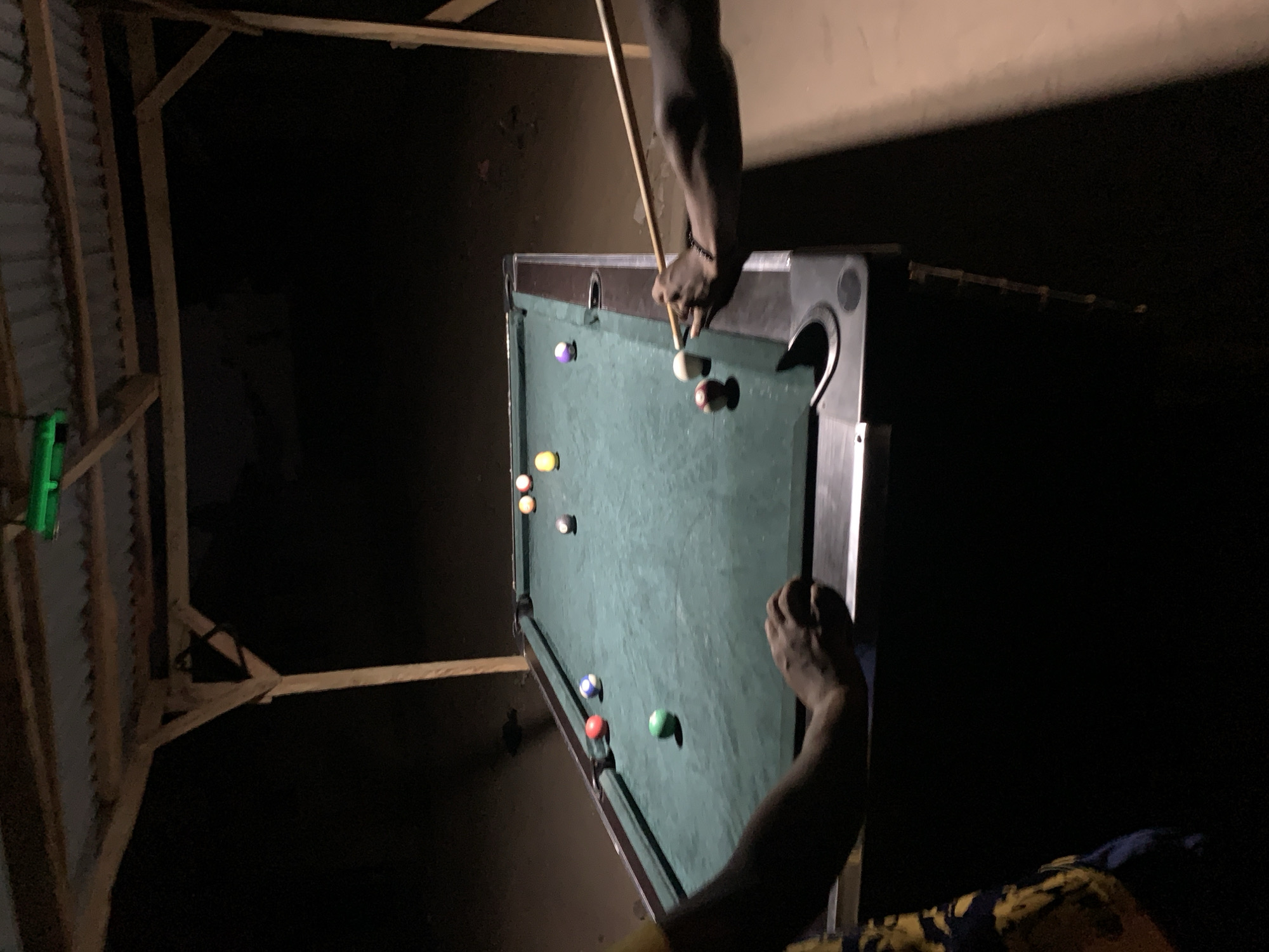 A dimly lit scene depicts a pool table with several billiard balls, a cue stick, and two individuals. The table is positioned inside a structure with exposed wooden beams, suggesting an indoor setting. One person is actively engaged in taking a shot, while the other person is viewing the playing. The location is likely a private residence or recreational facility in Lokoja, Nigeria. The setting is poorly illuminated.