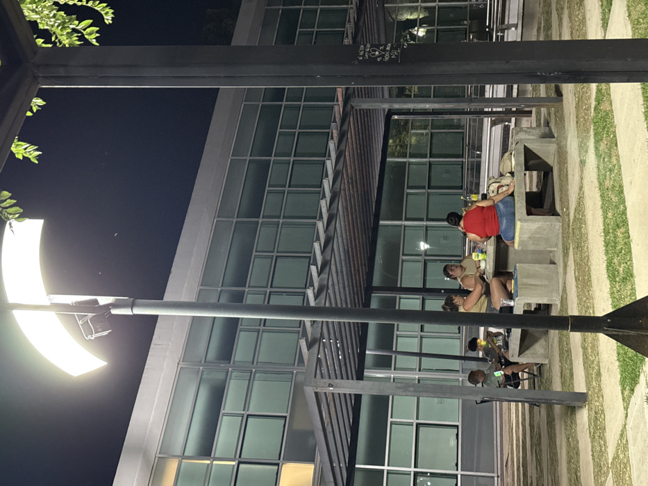 People are gathered at an outdoor seating area, possibly a patio, illuminated by a bright, curved light fixture. They are seated at concrete tables, and the scene suggests a casual gathering. The backdrop includes a modern building with multiple windows and a sloped roofline. There's greenery visible, including grass and some foliage at the top left of the frame. The lighting is dramatic, emphasizing the night setting.