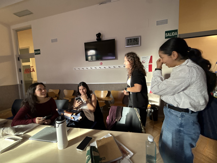 Four young women are gathered in a room. Two sit at a table with laptops, phones, and water bottles. One is speaking with curly hair, while the other is laughing, her hand near her face. The room has a TV on the wall, chairs against the wall, and a 'salida' sign above a doorway. The room is bright, and everyone appears to be having a conversation.