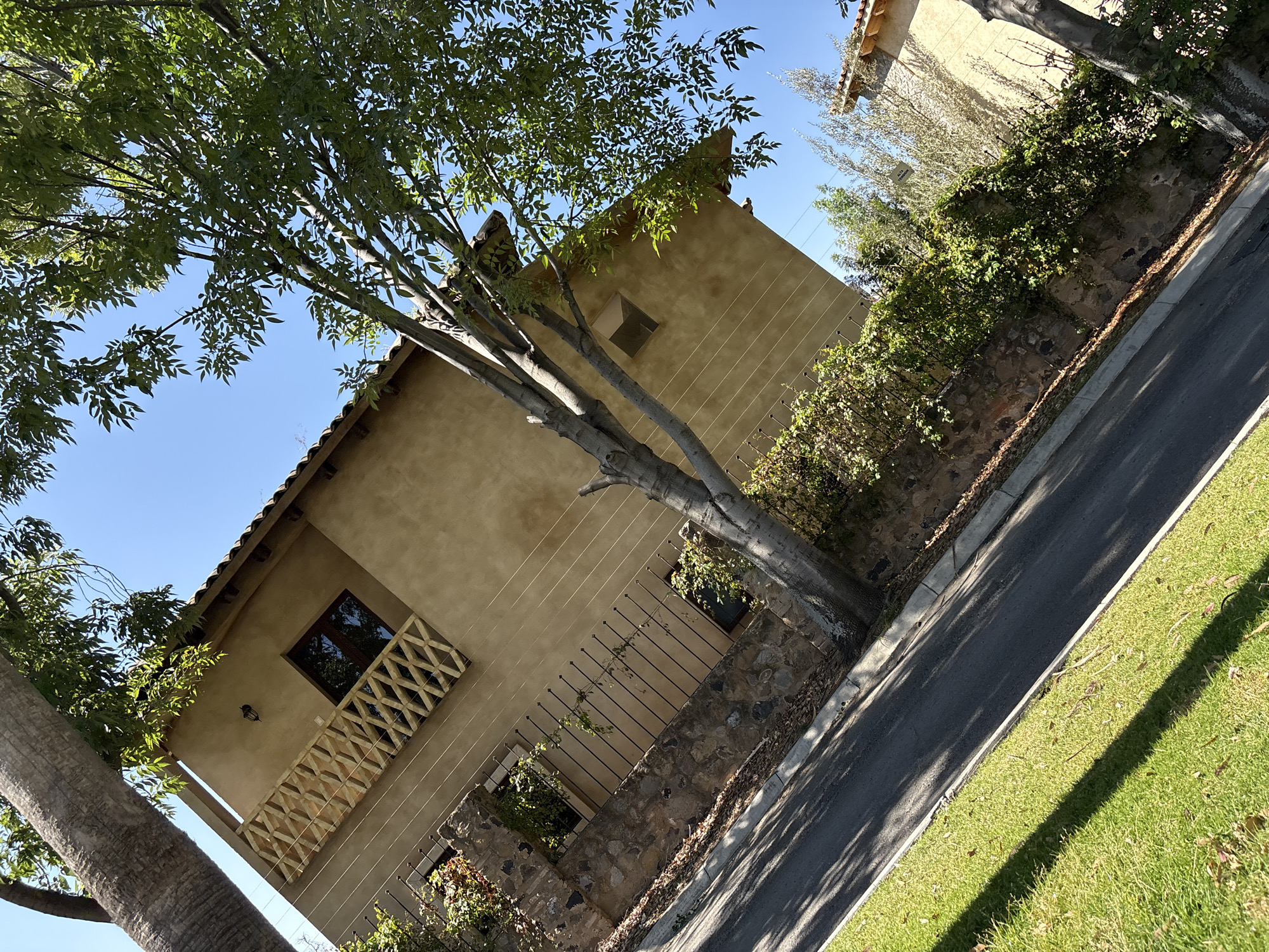 A low-angle, daytime shot reveals a residential scene in Cholula, Mexico. A two-story building with a stucco exterior dominates the frame, featuring a brown roof, a decorative balcony with a window on the second floor, and vegetation climbing on the first floor. A thin, deciduous tree with green leaves obscures part of the building and the clear blue sky. To the right of the building, there's a stone wall covered with green shrubs and a sidewalk, followed by an asphalt road and a patch of green grass. A thick palm tree trunk is visible on the left side of the frame. Wires run down the side of the building.