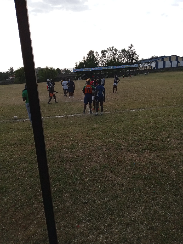 A sports field holds several individuals, seemingly in the midst of a rugby or football match. Some are in athletic uniforms, while others wear casual clothing. A ball rests on the field, near a person in a green shirt. Beyond the playing field stands a small bleacher-style seating area, partially obscured by trees. In the distance, a building with a blue and white color scheme can be seen. The frame is partially blocked by a dark pole.