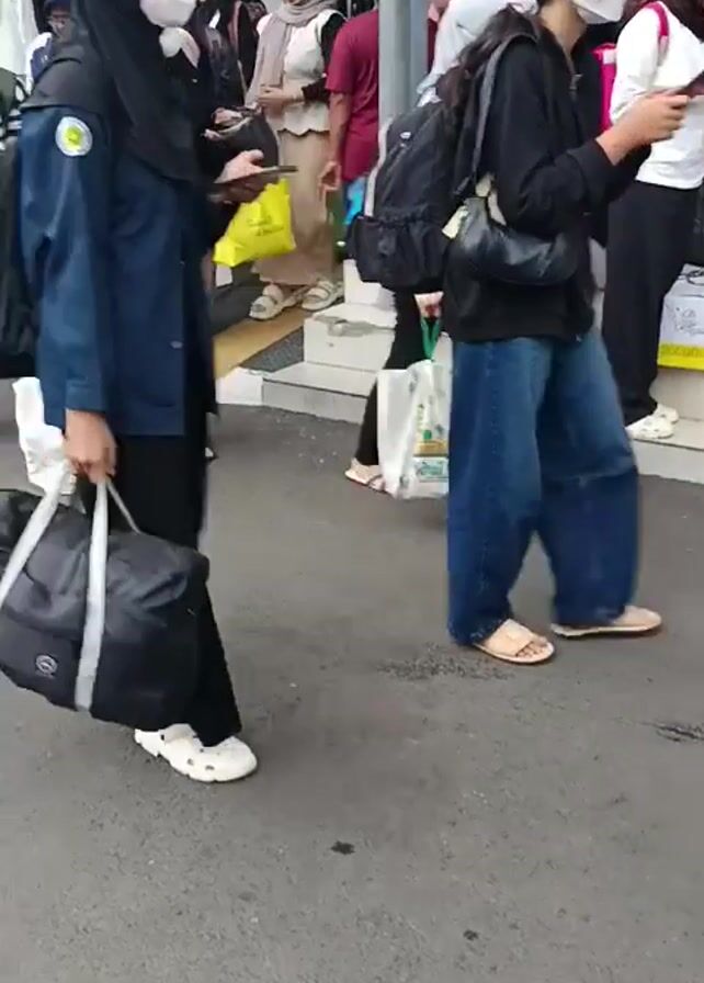 crowd of people walking outside a building. Most of the people are wearing casual clothes and some are carrying luggage, suggesting they may be arriving or departing from a train or bus station. Several women are wearing hijabs. One person in the first shot has blue slide sandals and is looking at a cell phone. The people are walking on asphalt, and there is a white curb behind them. The overall impression is of a busy public transportation hub.