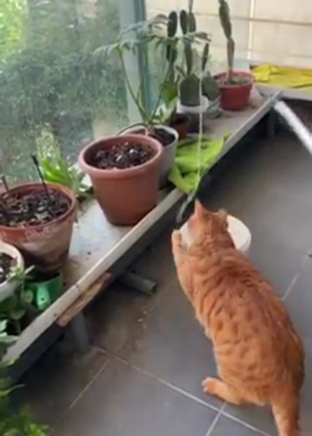 n orange cat interacting with a white wand toy indoors. The cat is initially seen standing near a white bucket on a gray-tiled floor, with a shelf of potted plants lining a window in the background. The person filming uses the wand to entice the cat, who swats at it with its paws. The wand is then moved away from the cat, and the video focuses on the wand and the shelf of plants. The plants include various types like orchids, cacti, and monstera, in different-sized pots, some terracotta and others in darker colors. Outside the window, there's green foliage visible. The video appears to be shot indoors with a static camera.