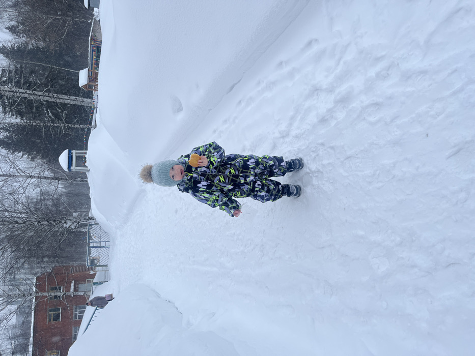 The scene depicts a snow-covered outdoor environment in Izhevsk, Russia. In the foreground, a young child, likely a toddler, stands centrally on a cleared path of packed snow. The child wears a full-body winter snowsuit with a black, grey, and neon green/yellow camouflage pattern, dark winter boots, and a light blue knitted hat topped with a large, light brown faux fur pom-pom. The child holds a light-colored, circular baked food item in their right hand and looks forward with a slight open-mouthed expression. The path is bordered by substantial snowdrifts, approximately waist-high to the adult in the background, indicating significant snowfall. In the mid-ground, a person, presumably an adult, dressed in a dark winter coat, walks away from the camera on the same path, carrying a pink bag in their left hand. They are partially obscured by the snowdrifts. In the background, to the left, a two-story brick building, possibly a kindergarten or school, with multiple windows and an entrance, is visible beyond the snowdrifts and a metal gate. To the right, partially buried in snow, are components of a children's playground structure, including a blue-domed shelter. A dense line of bare deciduous trees and some evergreens forms the distant background. Light precipitation, consistent with snow, is visible in the air.