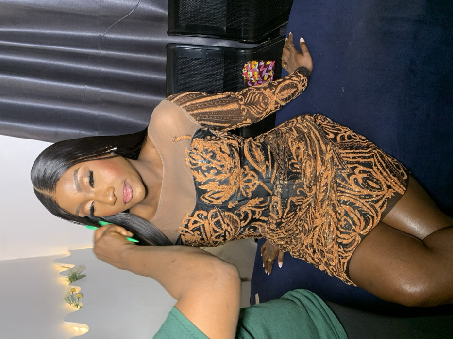 A woman in a black and gold sequined dress with sheer sleeves and neckline lies on a blue surface. A person in a green shirt is brushing her hair with a green brush. Behind her is a gray curtain, and two black speakers. A multicolored cloth is beside the speakers. In the corner, there is a string of lights with floral embellishments. The woman has dark skin and long, straight black hair.